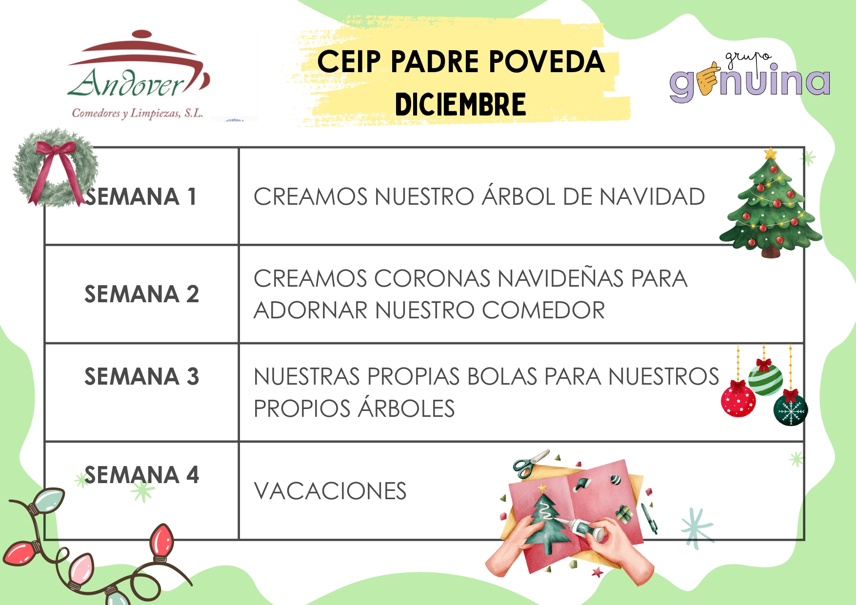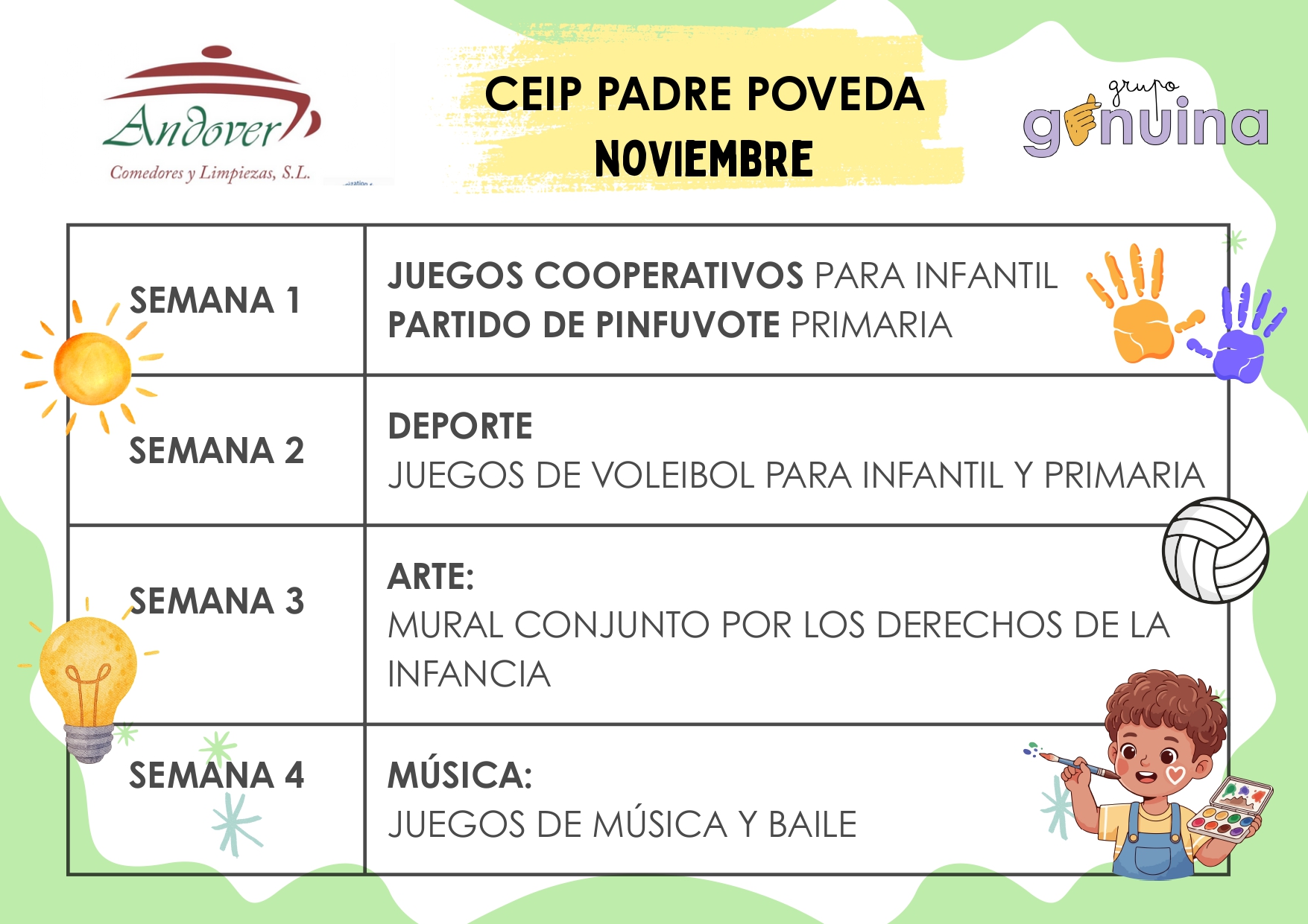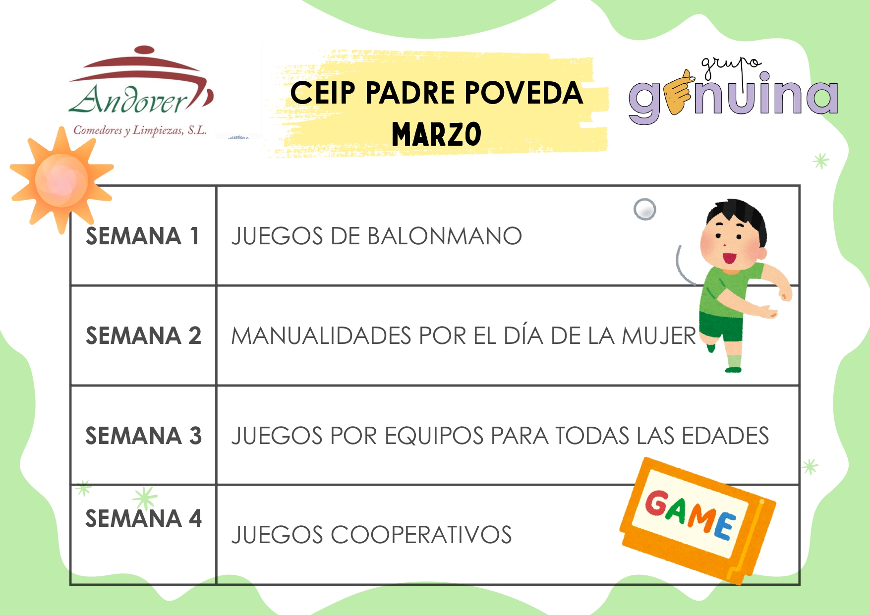 Actividades que los alumnos pueden realizar en tiempo de comedor. Os presentamos las actividades que la empresa Andover realiza durante este curso dentro de su Plan de Animación y Dinaminación de patios.