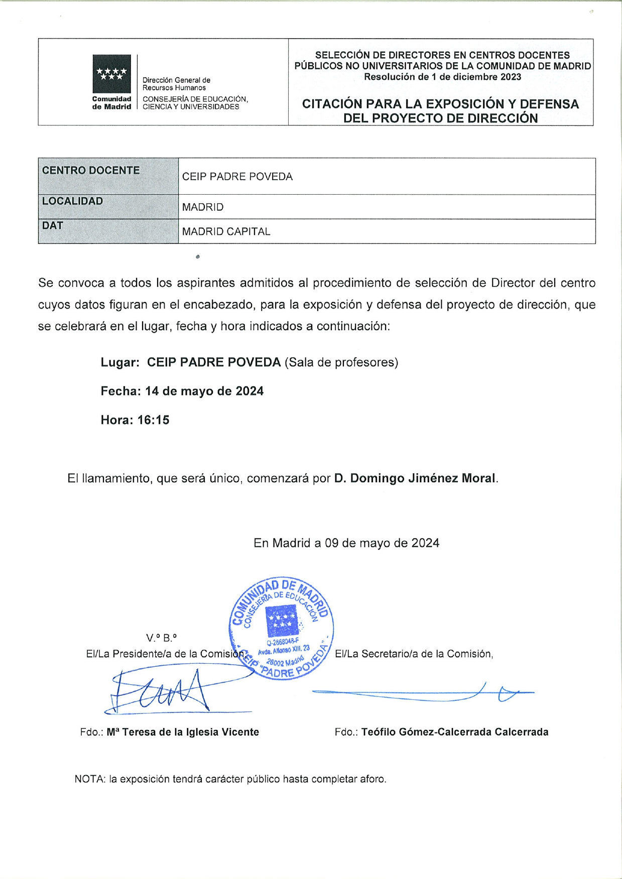 Citación para la exposición y defensa del proyecto de dirección.